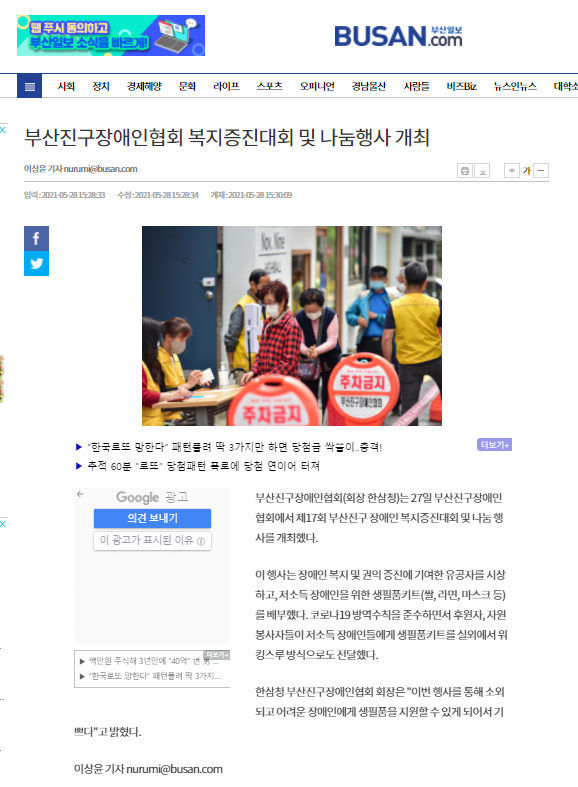 2021년 05월27일 제17회 부산진구장애인협회 복지증진대회및나눔행사 부산일보 보도내용