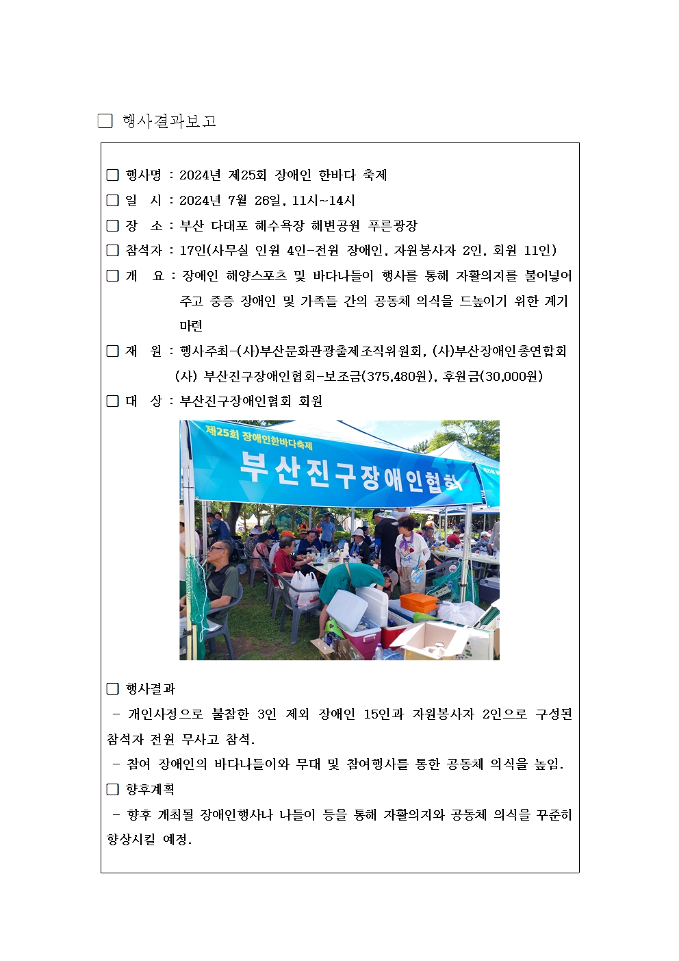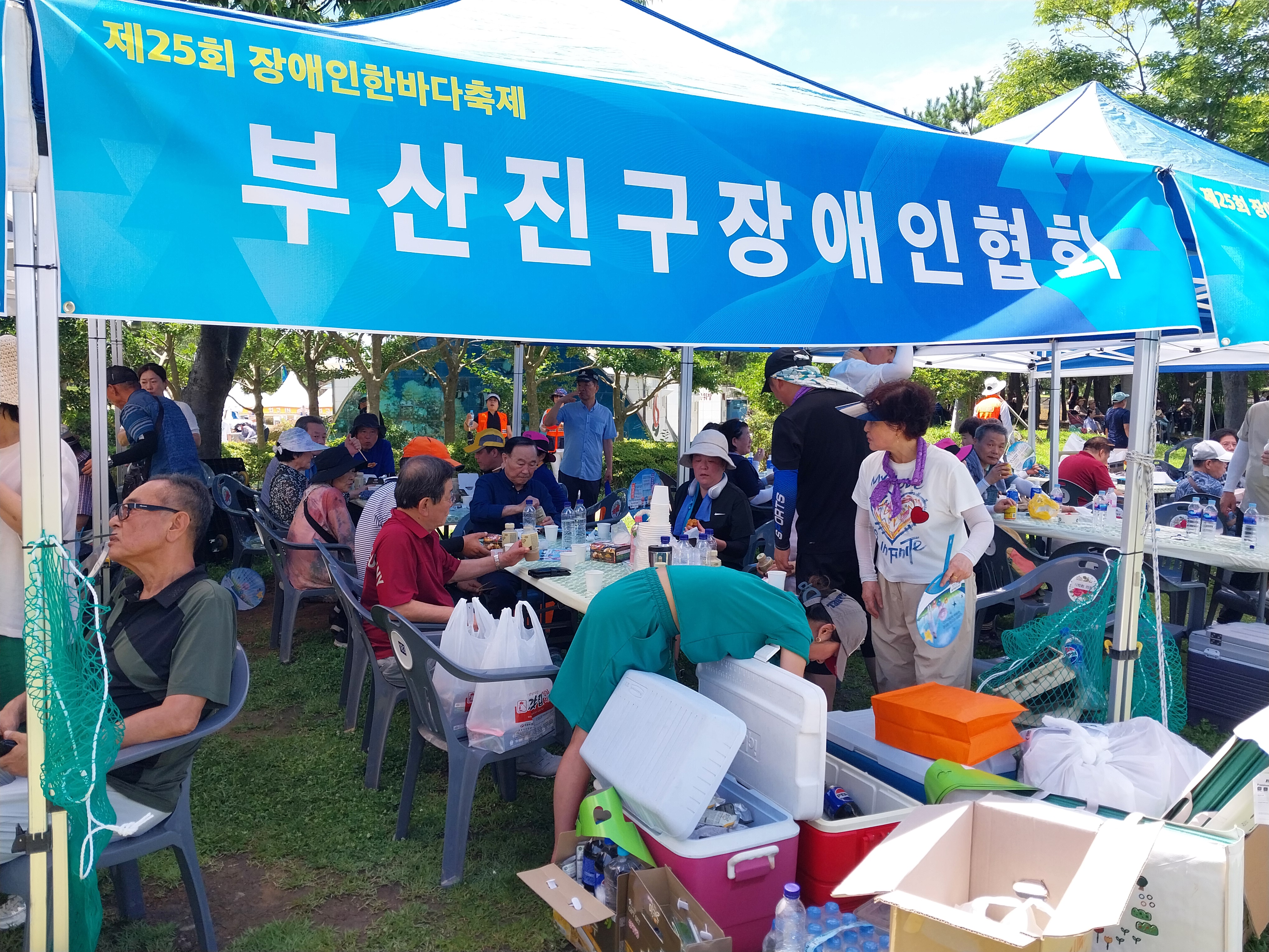 2024년 7월 26일 부산 사하구 다대포 해수욕장 해변공원 푸른광장에서 제25회 장애인한바다축제가 개최되었습니다. 오랜만에 바다에서 열린 행사에서 회원님들과 함께하여 더욱 행복한 시간이었습니다. 더운 여름 잘 보내시고 항상 건강하세요. 감사합니다.