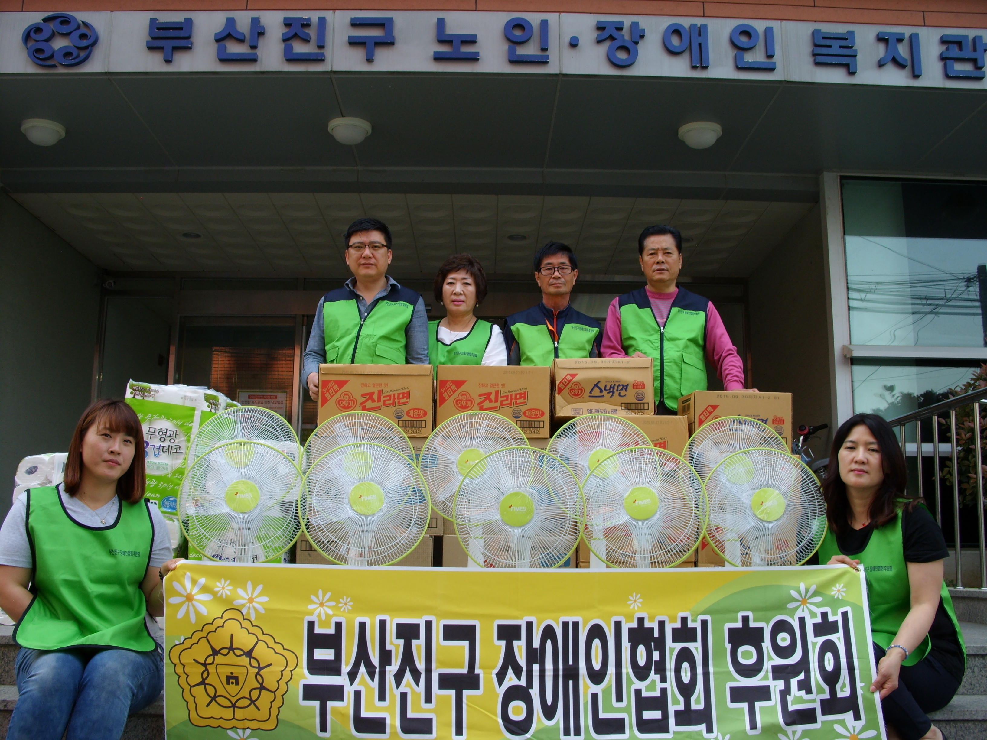 2015.5.7.(목요일) 부산진구장애인협회 후원회와 부산진구장애인협회는 부산진구거주 중증장애인가정 10가구를 선정하여 여름나기 나눔행사를 실시 선풍기.라면 ,화장지,김등 생필품을 전달하였다.