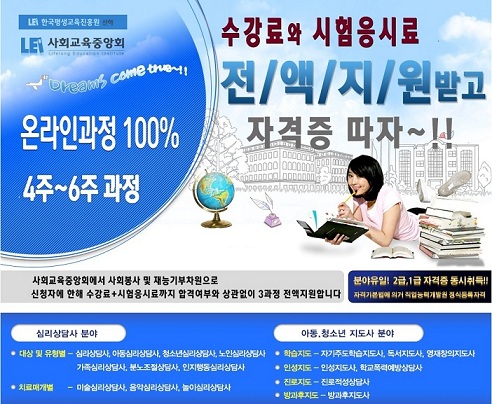 자격기본법에 의거 국무총리산하 한국직업능력개발원에 정식등록 민간자격증취득을 할 수 있는 사회교육중앙회 교육원 에서 개설하고 있는 모든과정에 대해서 사회봉사 및 재능기부의 일환으로 선착순신청자에 한해 무료지원을 해드릴 것이며 4주~6주과정으로 100%온라인과정으로 자격증 취득이 가능하며 본원은 해당분야에서 유일하게 2급자격증과 1급자격증이 동시에 취득됩니다.